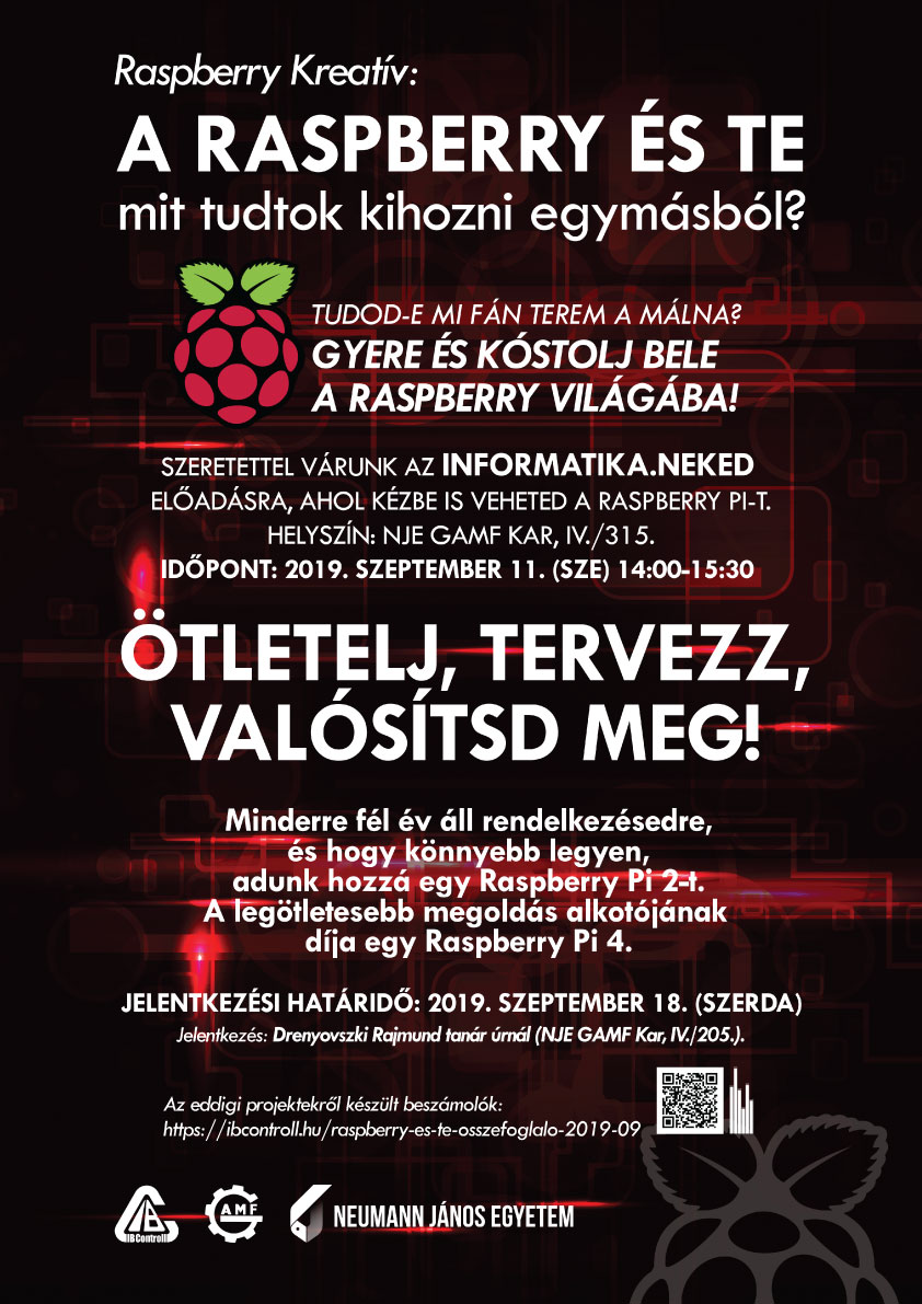 2019. szeptember 11-én 14 órakor az informatika.neked előadás keretei között bepillanthattok a málna világába, egy kóstolásra a vendégeink vagytok. Itt bemutatjuk az NJE GAMF Kar Informatikai Tanszékével együtt, hogy milyen ötletek születtek eddig, milyen lehetőségeket rejt magában ez a mini.